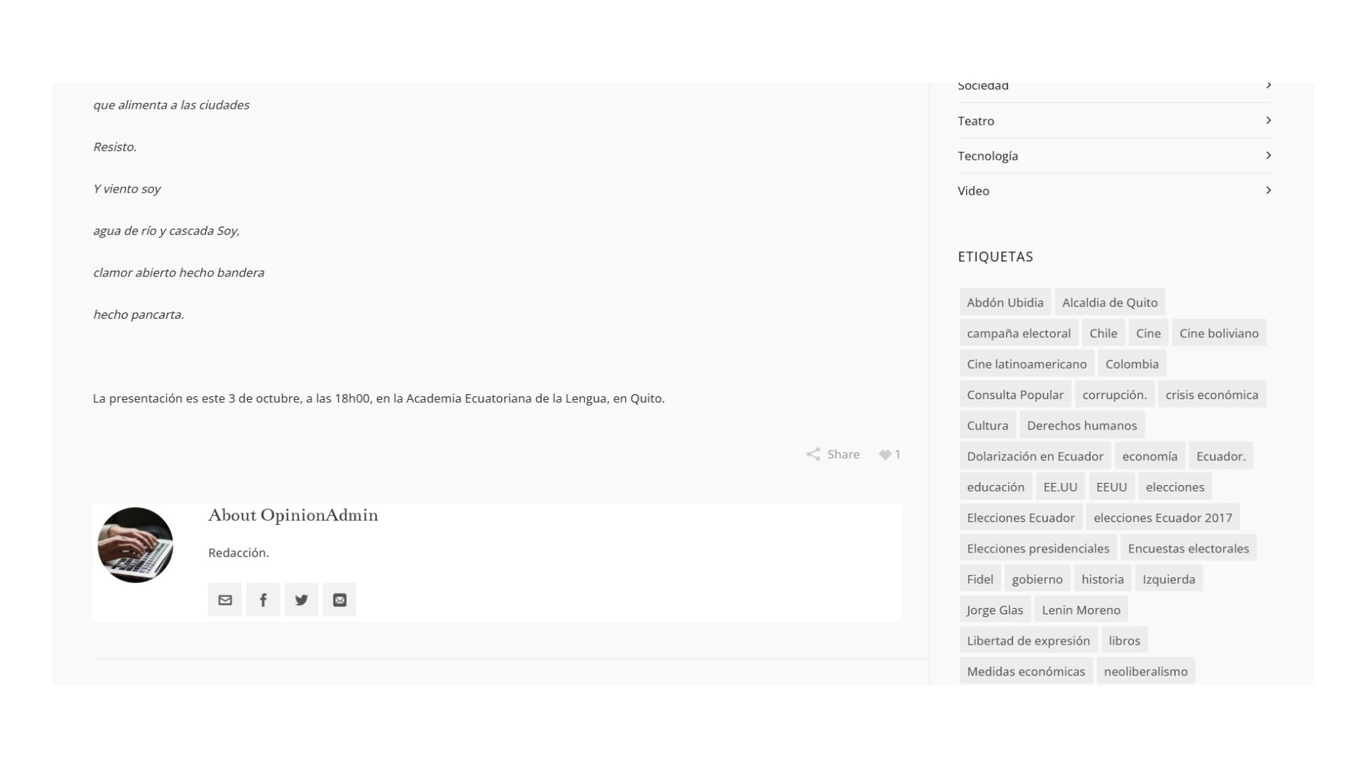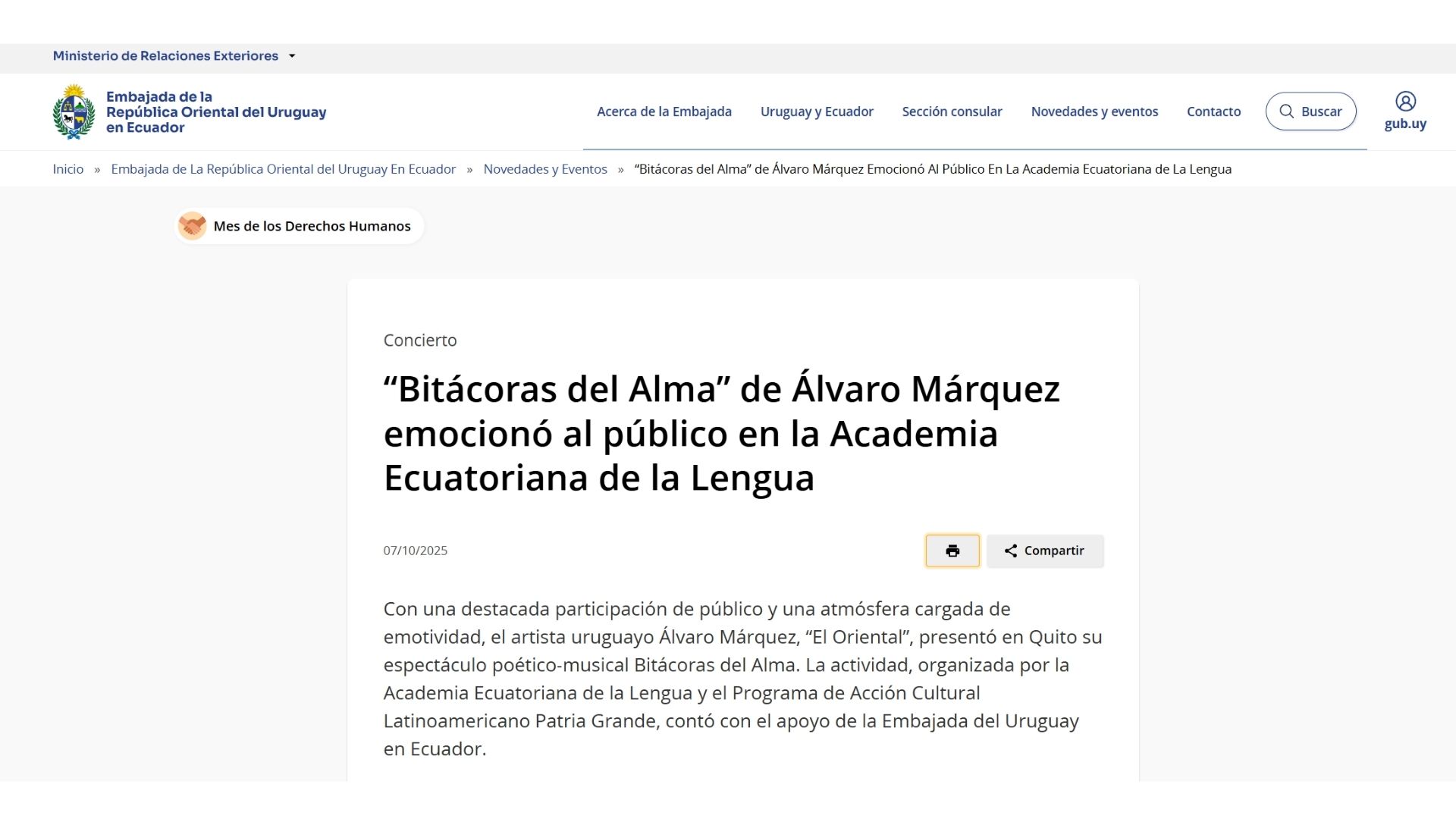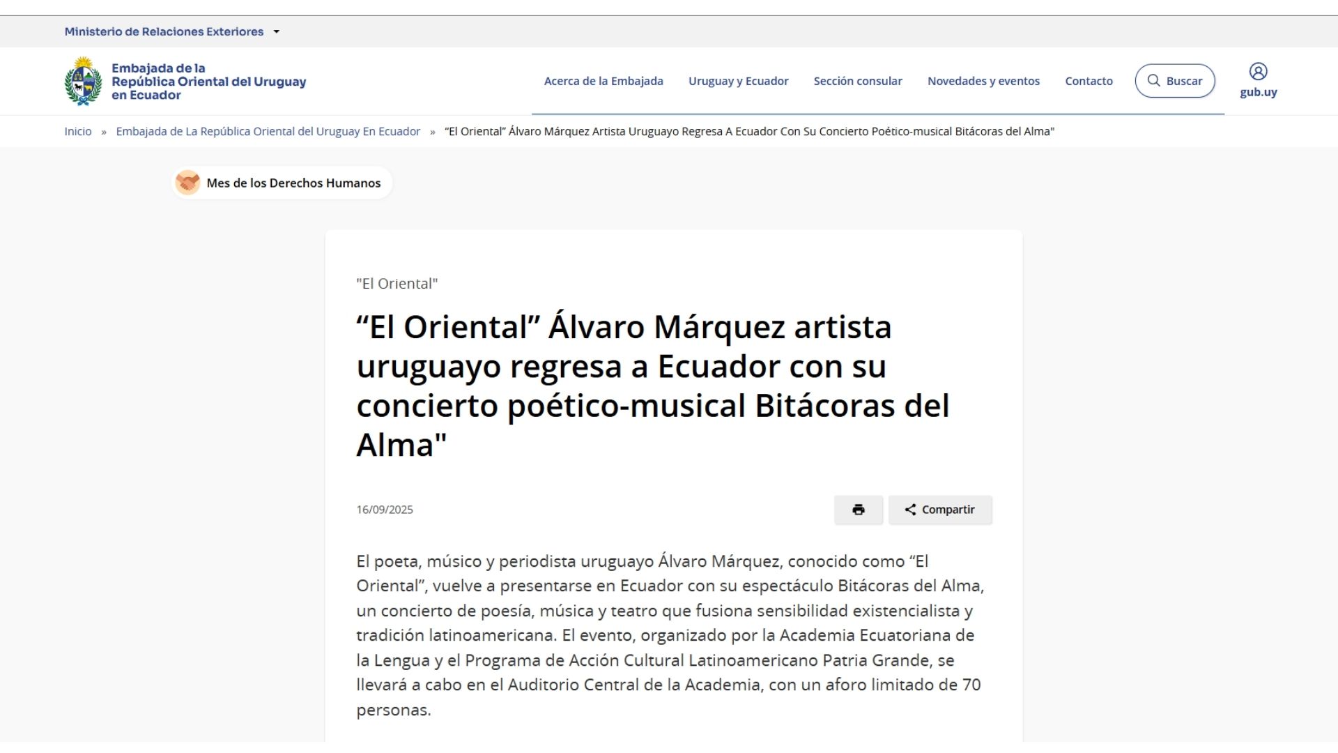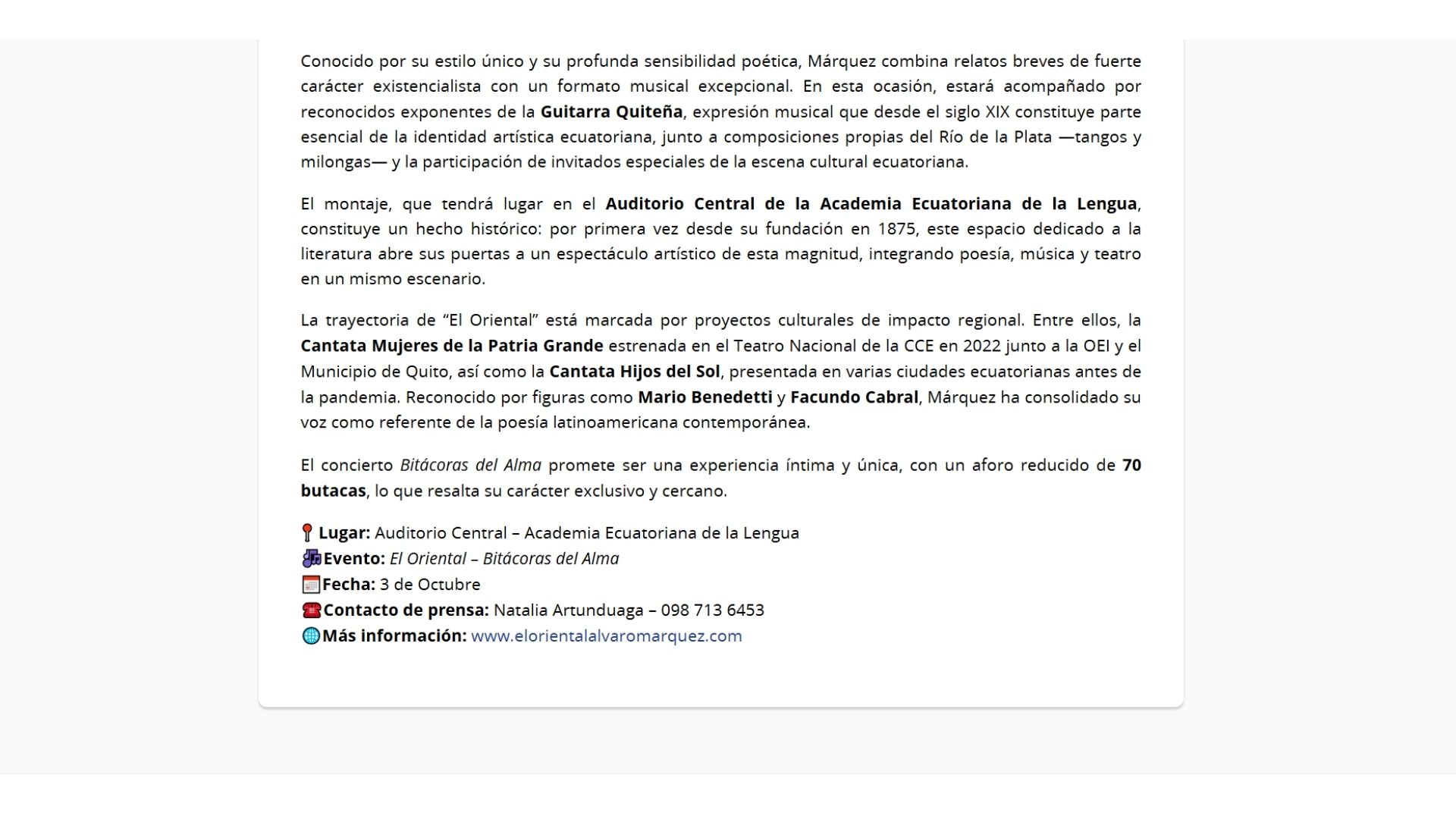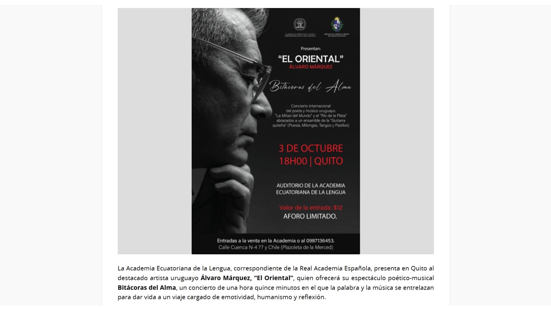 El pasado 5 de junio se presentó “El Oriental” Alvaro Márquez en la Sede Nacional de la PUCE (Pontificia Universidad Católica de Ecuador) con su evento artístico y académico Cantata “Mujeres de la Patria Grande”(Show y conversatorio  interactivo) ante un numeroso e importante público entre los que se encontraban autoridades de la prestigiosa Universidad y el Director de ese espacio “Auditorio Mayor” del centro Cultural PUCE Francisco Félix Arrieta, importantes referentes del ámbito cultural nacional, Directivos de la “Academia Ecuatoriana de la Lengua” , el embajador y destacado escritor Francisco Proaño junto a su colega escritor Julio Pazos (Premio Nacional “Eugenio Espejo”) e integrantes de diferentes cuerpos diplomáticos extranjeros, como el Sr Embajador de Rusia Vladimir Sprincham  y el Periodista y académico Marcelo Larrea. Fue una emotiva instancia que recorrió a través de la poesía e historias del revelador artista uruguayo “El Oriental” Alvaro Márquez, nombres e historias referidas a emblemáticas Mujeres latinoamericanas. La presentación se enmarcó en el inicio de un na de los Geraniuevo proceso de gira latinoamericana de su Compañía artística que acercará la obra a paises como Ecuador, Uruguay, Colombia y Chile.