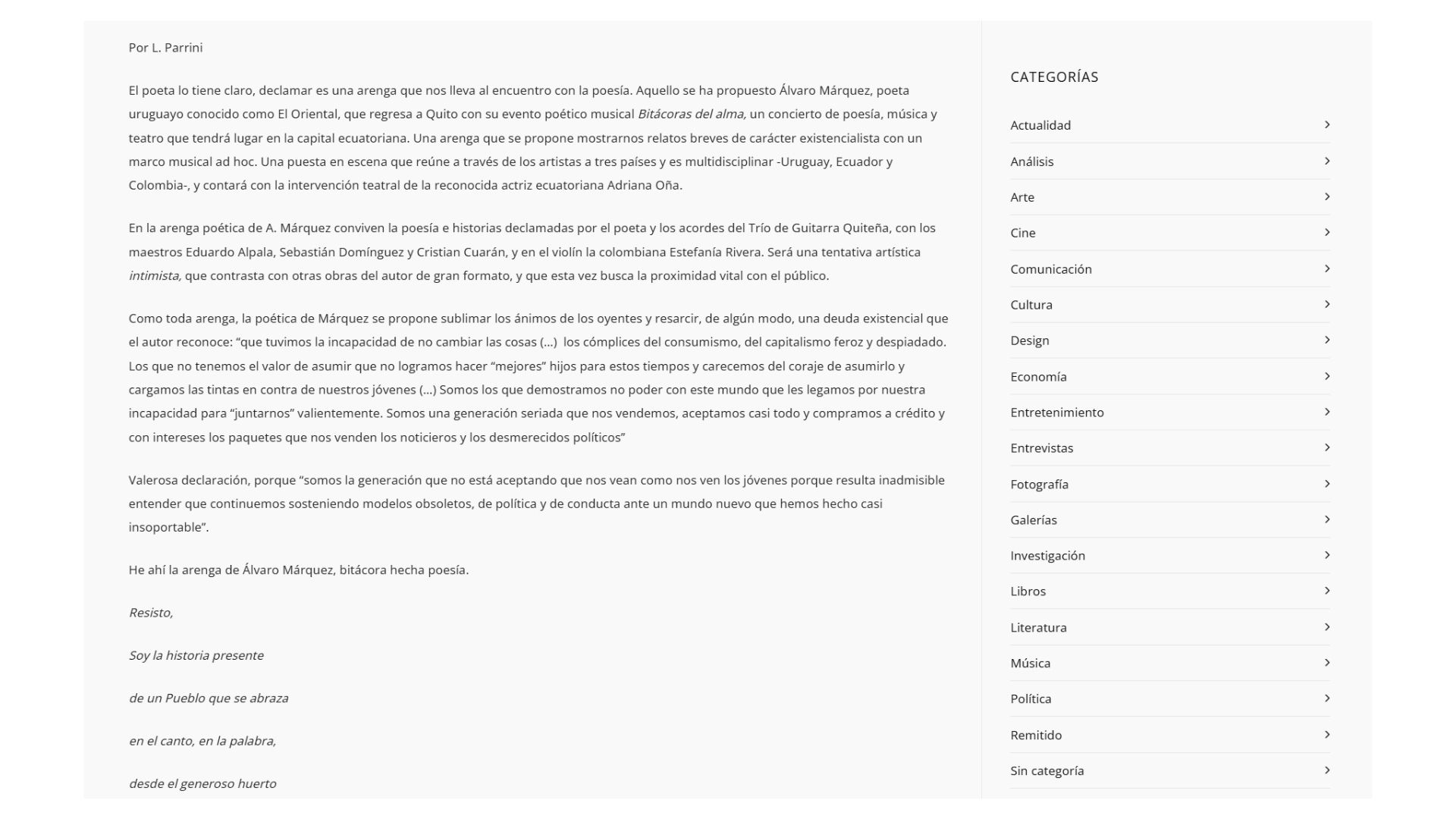 Llega próximamente a todas las plataformas “Voces encarnadas” una valiosa e impecable producción conjunta entre la CCE (Casa de las Culturas ecuatorianas) y el Programa de Acción cultural latinoamericano “Patria Grande”, con la poesía de “El Oriental” Álvaro Márquez en audio y video, encarnada en las voces de 20 personalidades referentes del ámbito social, cultural, intelectual y académico del Ecuador. Un maravilloso trabajo que reúne a valiosos nombres interpretando los textos (Poemas y narraciones) del artista, escritor y periodista uruguayo